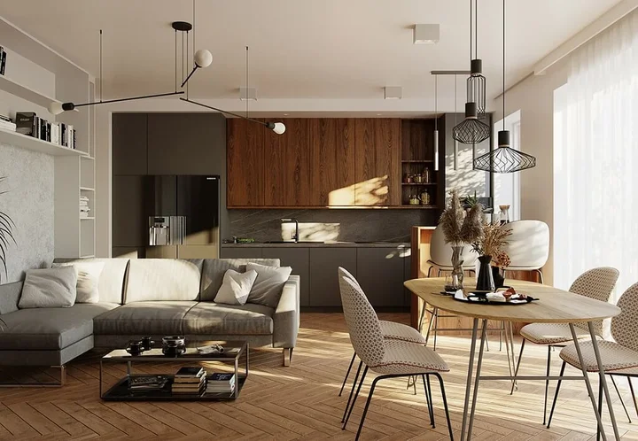 W aranżacjach nowoczesnych wnętrz dominuje prostota formy i oszczędność detali. Stawia się na geometryczne kształty oraz materiały takie jak metal, szkło i tworzywa sztuczne. Lampy często mają szczupłą konstrukcję, co podkreśla lekkość całej kompozycji.