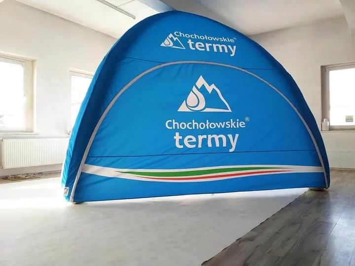 Personalizacja namiotu pneumatycznego to nie tylko logo, ale możliwość zadrukowania 100% powierzchni, co zamienia stoisko w gigantyczny billboard reklamowy. Jeśli Twoja marka stawia na skomplikowane grafiki, zdjęcia czy przejścia tonalne (gradienty), postaw na nadruk sublimacyjny. Gwarantuje on fotograficzną precyzję i kolory identyczne z Twoją księgą znaku (Pantone). Z kolei jeśli planujesz intensywny sezon eventowy i boisz się o zarysowania, lepszym wyborem będzie nadruk solwentowy z laminacją - jest pancerny i wyjątkowo odporny na ścieranie. Koszt pełnego brandingu zamyka się zazwyczaj w przedziale 800-1500 zł, co przy skali oddziaływania na 30 tysięcy osób jest inwestycją, która zwraca się błyskawicznie.